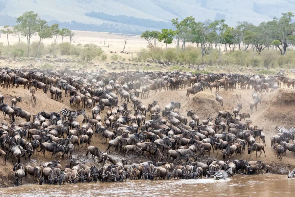 The Mara River crossing is the most intense part of the migration. Thousands of wildebeest and zebras jump into crocodile-filled waters. They face strong currents and hungry predators waiting on the banks. It’s a risky journey for them, but for you, it means incredible photo chances. You will see nature in its rawest form. This exciting moment is a highlight of any Kenya trip.